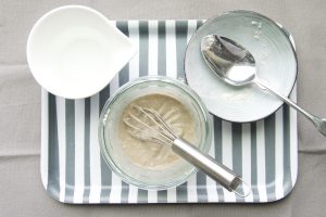 Gießen Sie nun langsam so viel lauwarmes Wasser zum Mehl und rühren Sie es mit einem kleinen Schneebesen bis ein gelartiger Mix entsteht. Lassen Sie diese Mischung etwa 15 Minuten quellen. Wer die Haare einfach nur reinigen möchte, kann die Mischung nur kurz quellen lassen. Wer mehr Pflege braucht und weniger fettige Haare hat, kann die Mixtur bis zu zwei Stunden oder über Nacht stehen lassen.