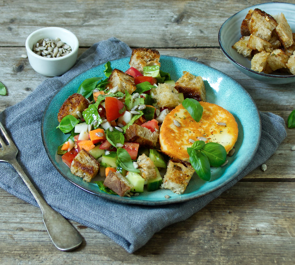 Anschließend Halloumi auf dem heißen Grill oder in einer heißen Pfanne von beiden Seiten in 5–7 Minuten bei mittlerer Hitze anbraten. Gemüse und Brot mit dem Dressing vermengen und auf zwei Teller anrichten. Käse daneben setzen und mit Basilikum sowie Sonnenblumenkerne bestreut servieren.